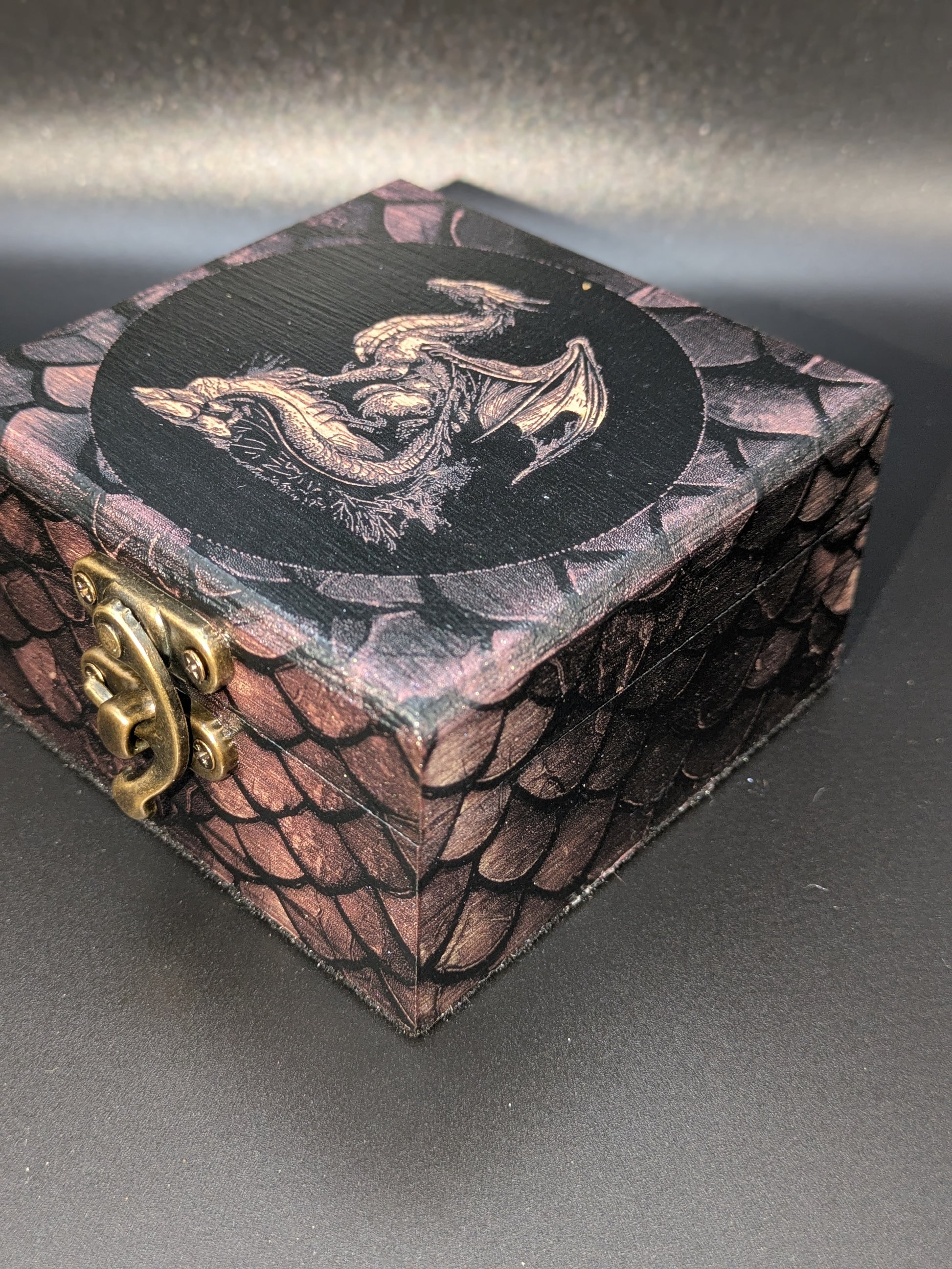 Dragon Picture Box. Hand painted and laser engraved with felted bottom and velvet liner.