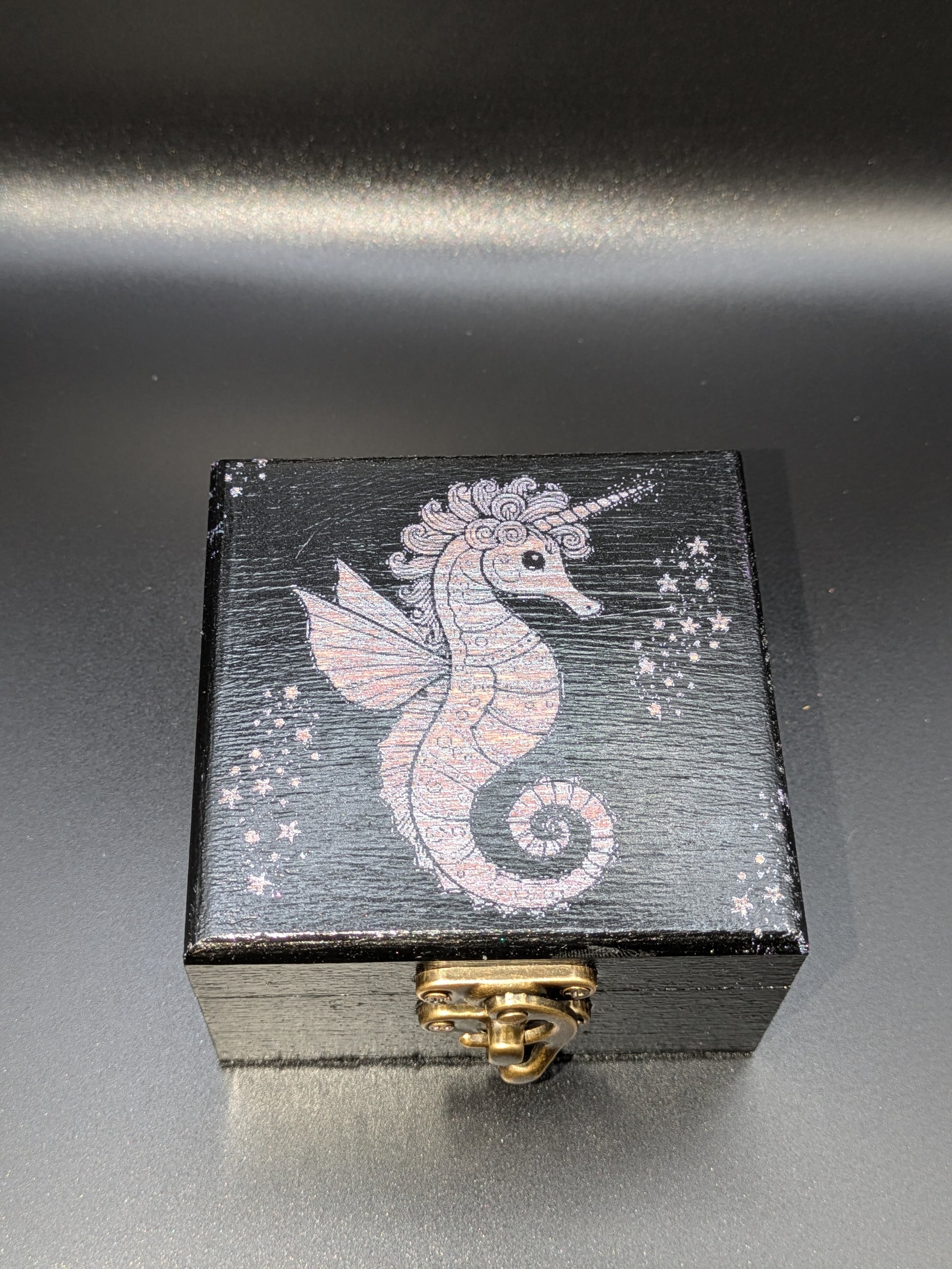 Seahorse Trinket Box. Hand painted, laser engraved, felted bottom and velvet interior.